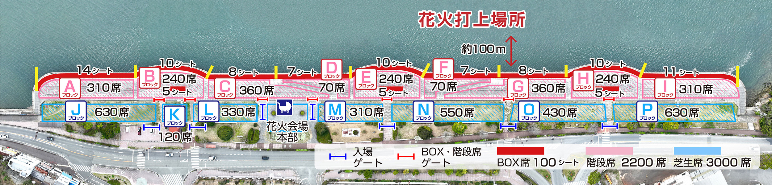 - 会場機材の設営等、花火大会開演のためにやむを得ない事由により座席位置の移動をお願いすることがあります。